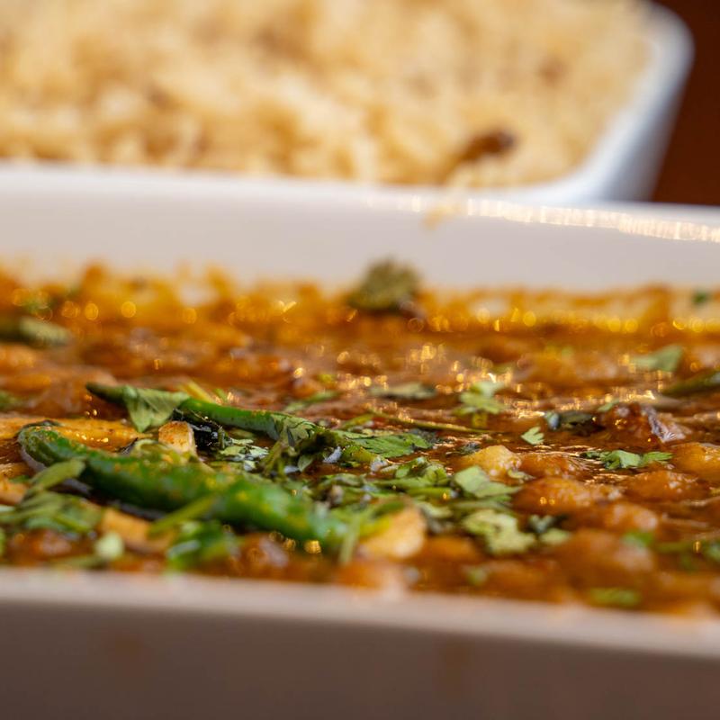 Cooked in work (karhai) with spice, tomato, ginger, garlic, and chilies. Served with rice.