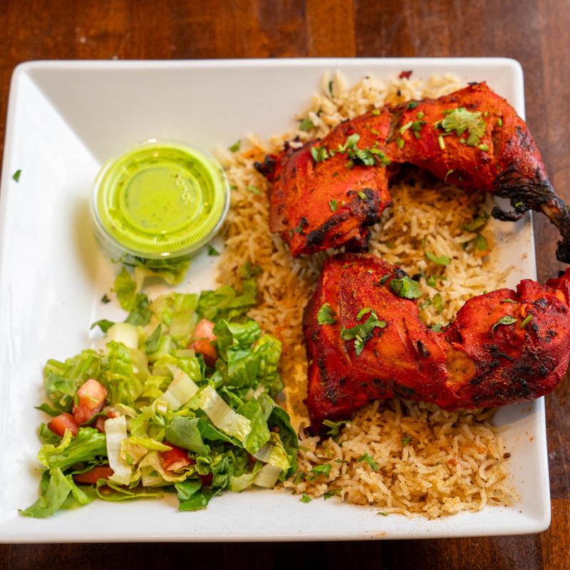Marinated in lemon juice, spices, ginger, and garlic. Grilled in tandoor. Served with rice, salad and our signature sauce