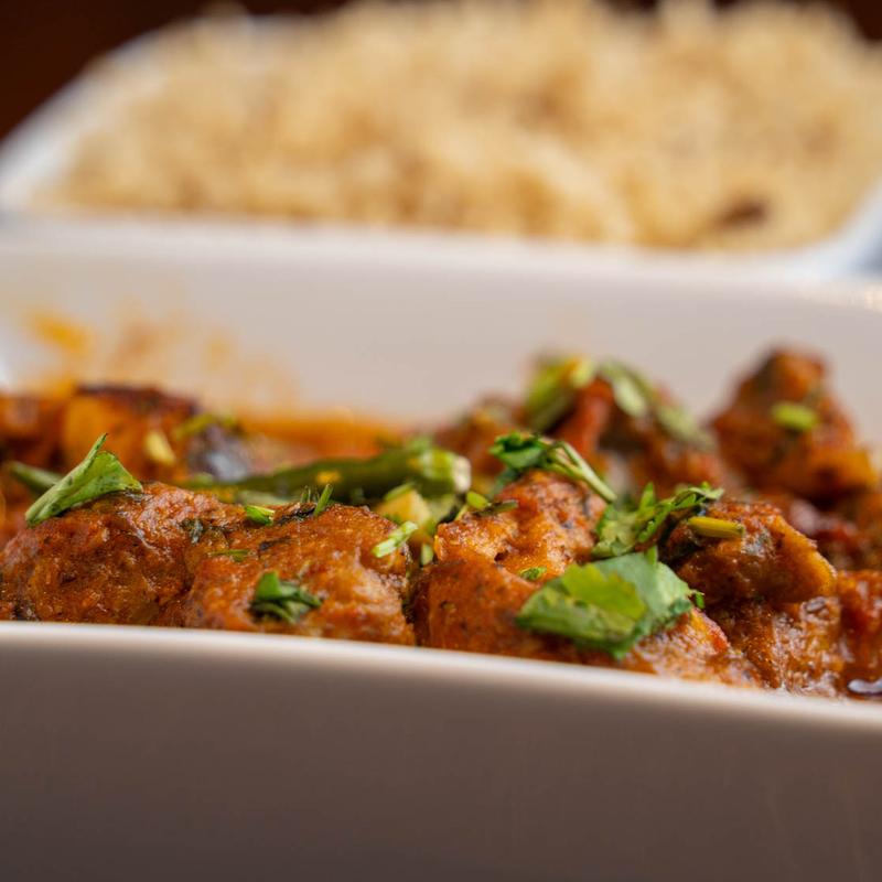 Meat cooked with onion, yogurt and house spices. Serve with side of saffron rice spice level usually medium 24 oz. serving, two people can eat.